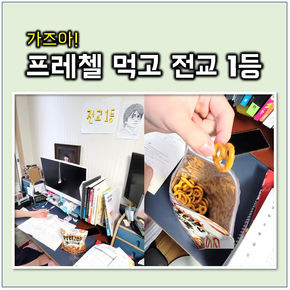 과자 먹으면서 공부 잘 되냐고 물으니까, 프레첼이 짭쪼롬해서 문제 풀면서 먹기 좋다고 하네요.