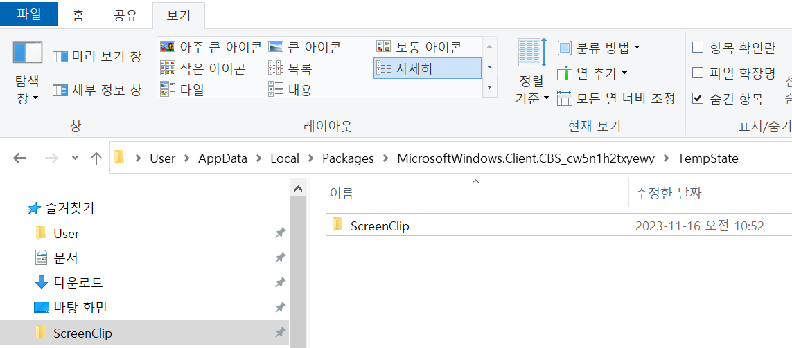 바로 아래 경로에 있습니다. 그냥 찾아가면 굉장히 어려운데요. 우리의 목적지는 캡처 및 스케치 이미지를 자동 저장하고 있는 "ScreenClip" 폴더입니다.