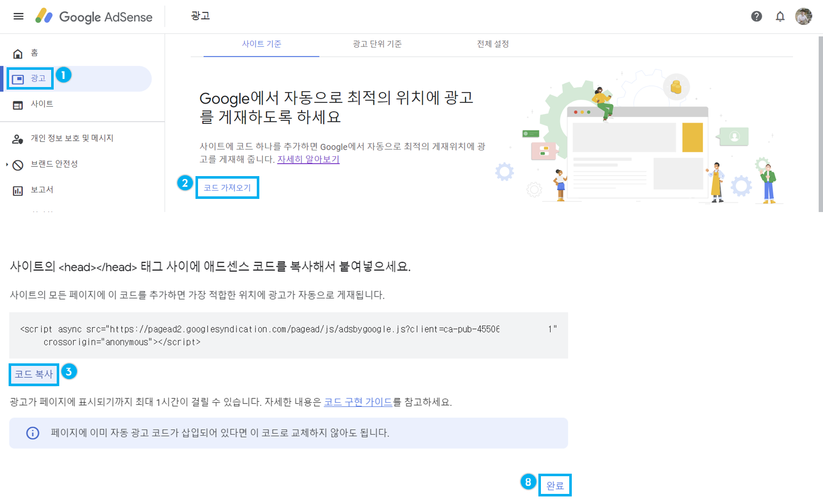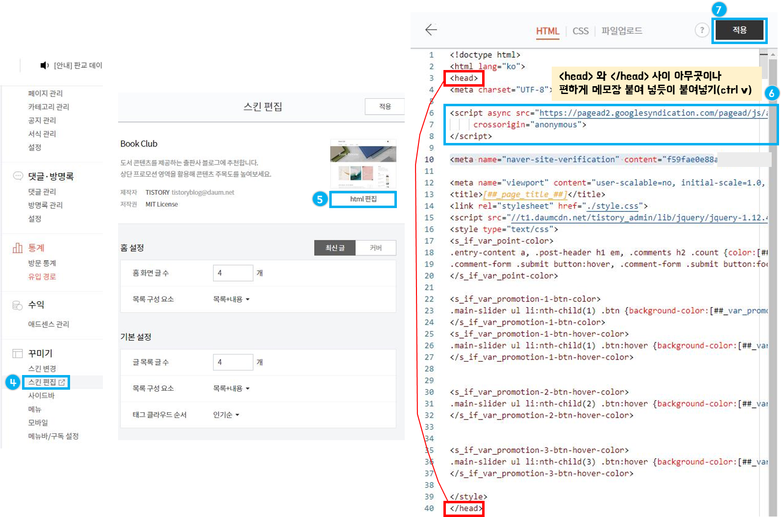 4. 구글 애드센스의 코드를 내 티스토리에 붙여넣기