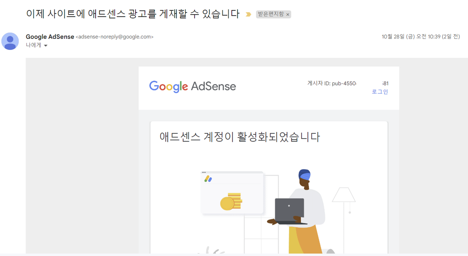 구글 애드센스 승인이 완료되면 이와 같은 메일이 도착하며, 바로 광고가 붙습니다. 티스토리 관리자 계정이 아닌 일반 사용자가 내 티스토리에 접속했을 때 광고가 보이게 됩니다. 정말 감동의 순간이죠!!