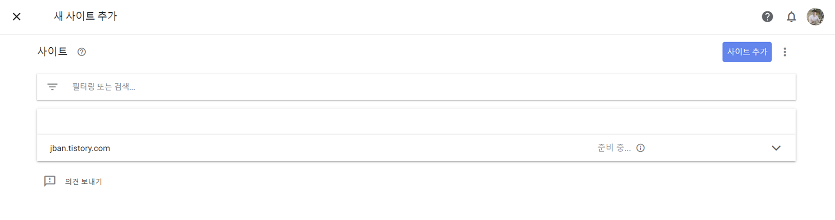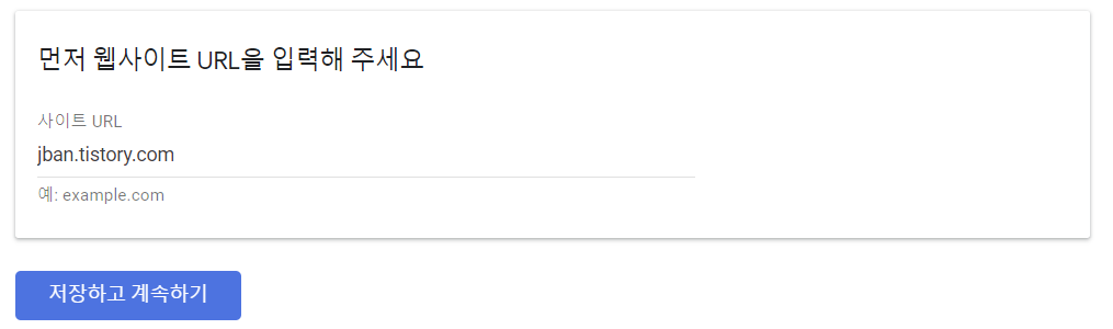 - '사이트 추가' 클릭 후 내 블로그 주소 입력 → '저장하고 계속하기' 클릭