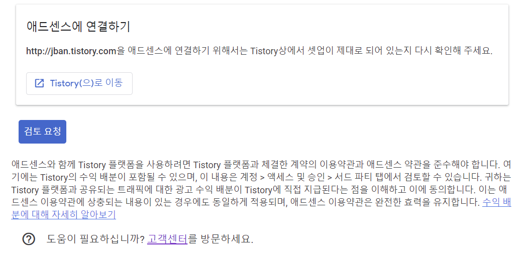- 티스토리에서 애드센스 연동 후 다시 애드센스로 돌아와서 '검토 요청' 클릭
