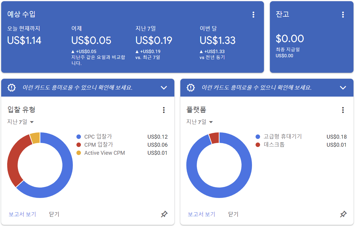 애드센스 승인 3일째, 1.14 US 달라의 수익 발생