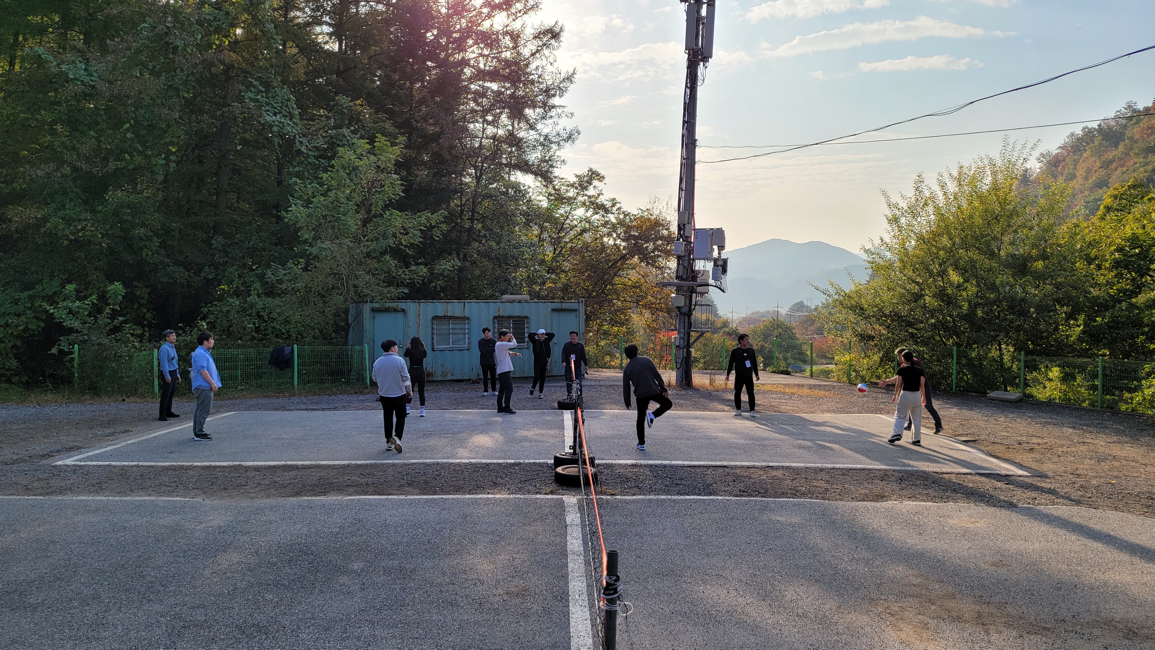 홈페이지를 통해 확인해 본 바로 족구장은 없었던 것 같은데, 사전 답사를 와 보니 족구장이 있는 걸 확인할 수 있었습니다. 요즘 누가 족구 하나? 이렇게 생각했었는데, 젊은 여직원들까지... 이래서 검증해 보기 전에 섣부른 판단은 금물이라는 교훈을 다시금 되새길 수 있었습니다. 참고로 지금 보시는 족구장 왼쪽 편으로 큰 건물(세미나실 같은)이 있던데요. 거길 빌려 워크숍을 하는 회사도 있었습니다. 저희 직원들은 남의 앞마당에서 족구를 하는 그런 과감한 스케일을 보여줬습니다!! 족구장은 예약제는 아니고 먼저 가서 자리를 잡아야 하는 점 참고 부탁드립니다. 저 공간에서 O/X 퀴즈도 했는데요. 족구 네트를 기준으로 하니까 O/X 구분하기 좋았습니다.