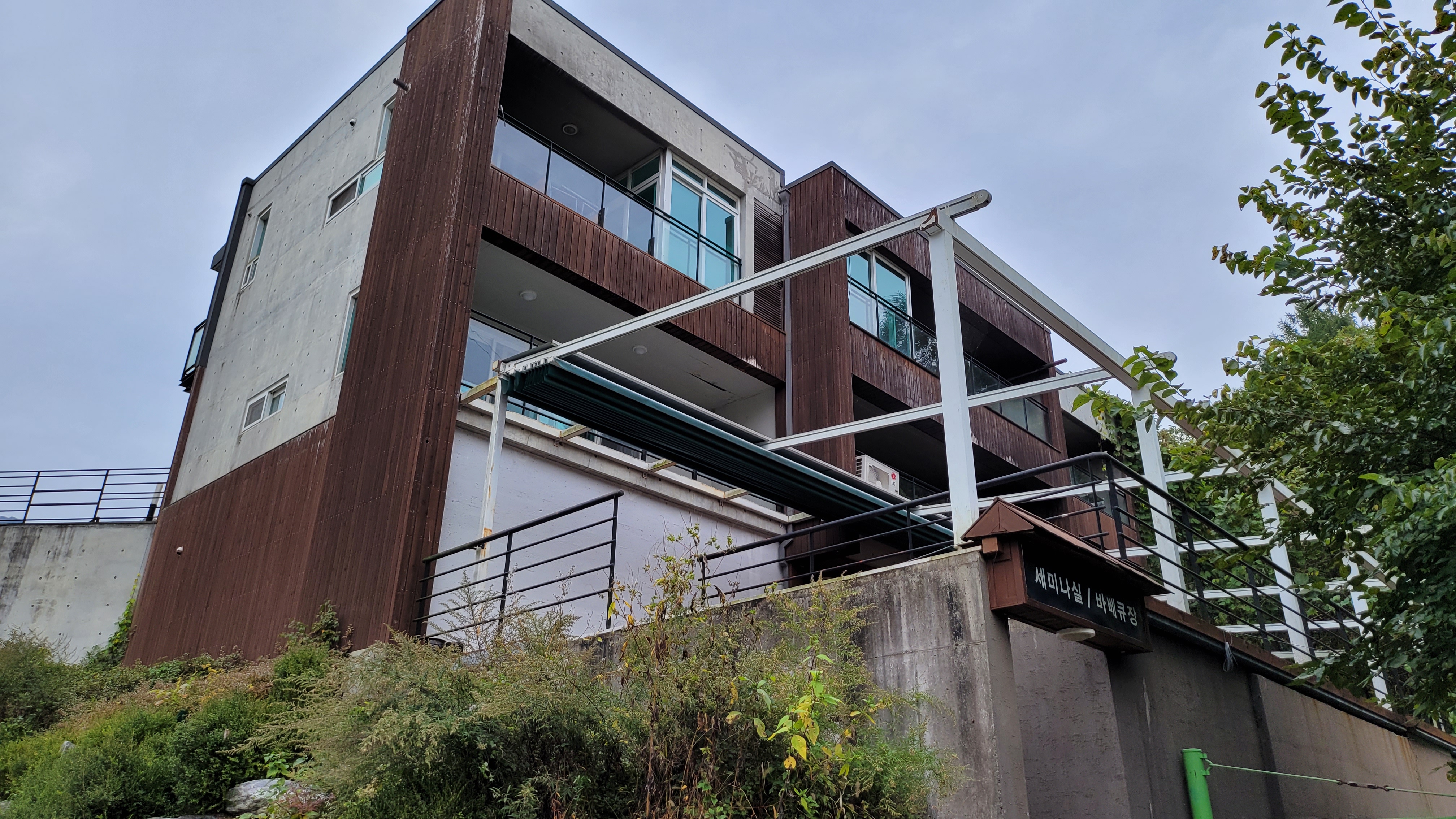 5동의 뒷면 인데요. 여기가 교육장(세미나실)과 바비큐 장이 있는 곳입니다. 세미나실 앞 나무 데크에서 바비큐 진행.