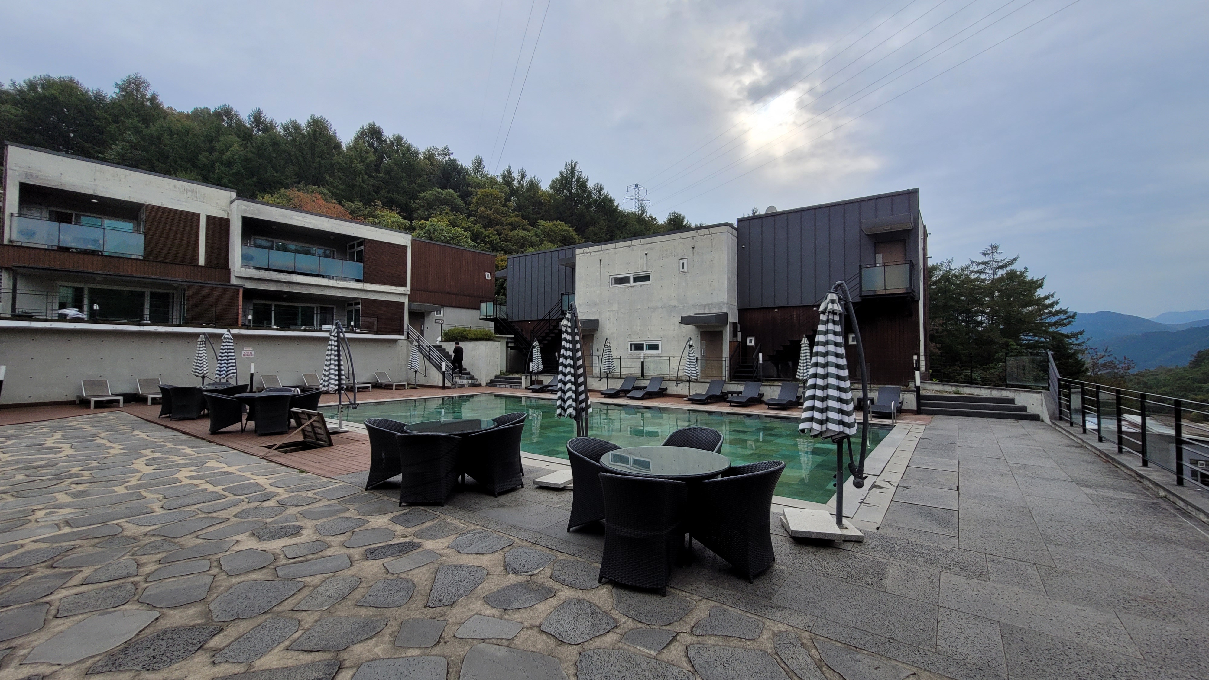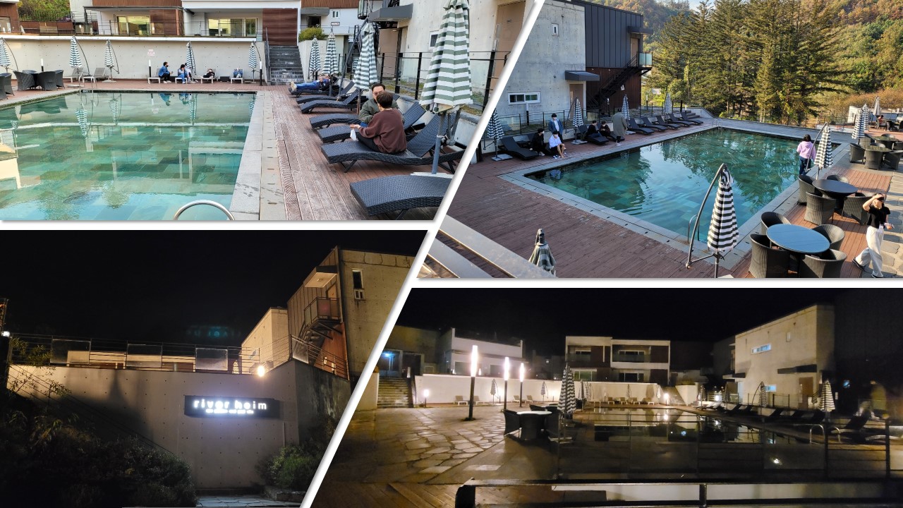 가평 리버하임 풀빌라!! 풀빌라답게 숙소 앞에 널찍한 풀빌라가 있습니다. 10월 셋째 주인데 주말에는 온수를 틀어 주신다고 하셨습니다. 평일에는 10만 원가량 지불할 경우 온수 풀을 이용할 수 있다고 하는데요. 혹여 워크숍에서 술 마시고 사고 날까 봐 수영 얘기는 직원들에게 꺼내지 않았습니다. 행사 주관자 입장에서 절대 안전! 만큼 중요한 게 없죠. 특히나 백화점 출신인 제게는 '안전관리'를 하는 건 '필수'입니다. 온수가 얼마나 따뜻할지 모르겠지만, 정말 운치 있을 것 같습니다. 제가 워크숍 1주일 전 주말에 답사를 다녀갔는데요. 여기 말고 다른 동에서 프라이빗 풀파티가 한창인 곳도 있었어요. 저도 조금 젊었을 때엔 친구들과 파티도 하고 그랬었죠^^;;;