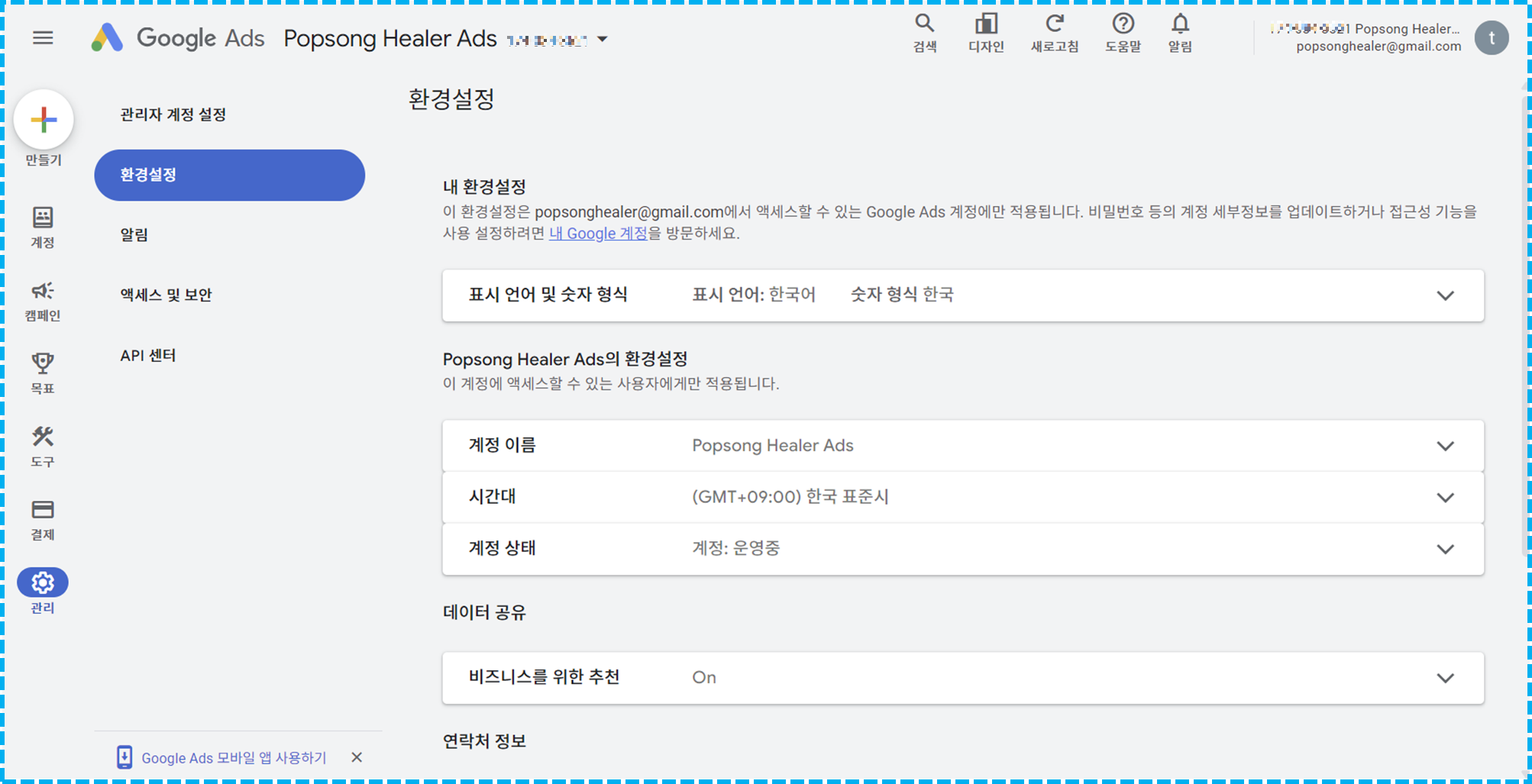 짜~~잔, 이렇게 구글애즈(Google Ads)의 언어가 영문에서 한국어로 변경된 것을 확인할 수 있습니다^^