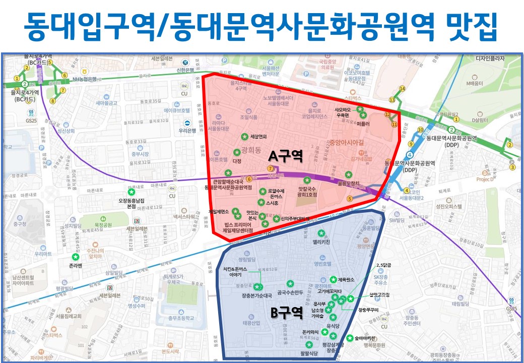 3호선 동대입구역 2번 출구 태극당쪽으로 나오시면 거의 다 맛집이구요. CJ제일제당 근처에도 맛집들이 있습니다.