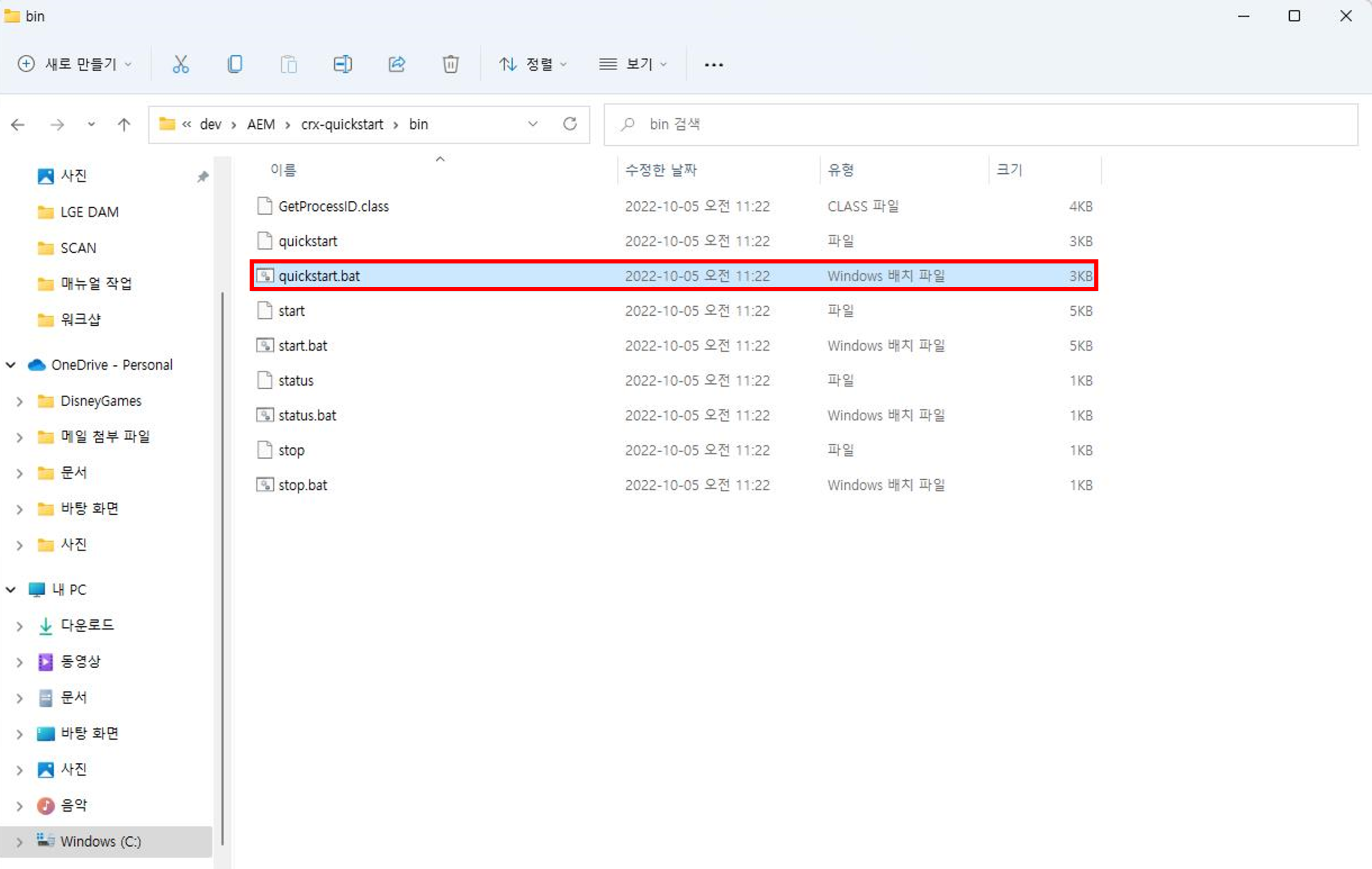 C:\dev\AEM\crx-quickstart\bin 에서 'quickstart.bat' 클릭