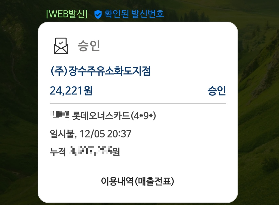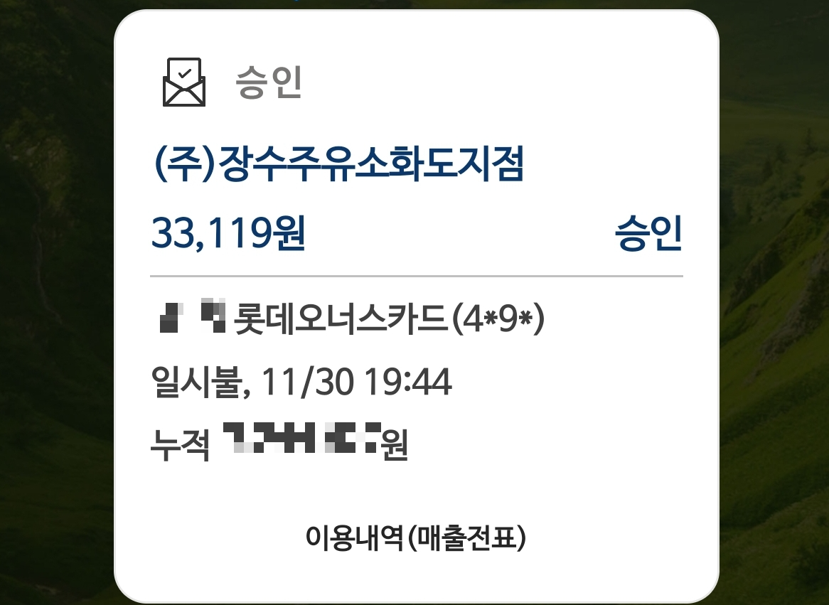 일주일도 채 되지 않은 12/5일, 월요일 퇴근길에 기름 게이지 한 칸을 채우는데 24,221원을 결제했습니다.