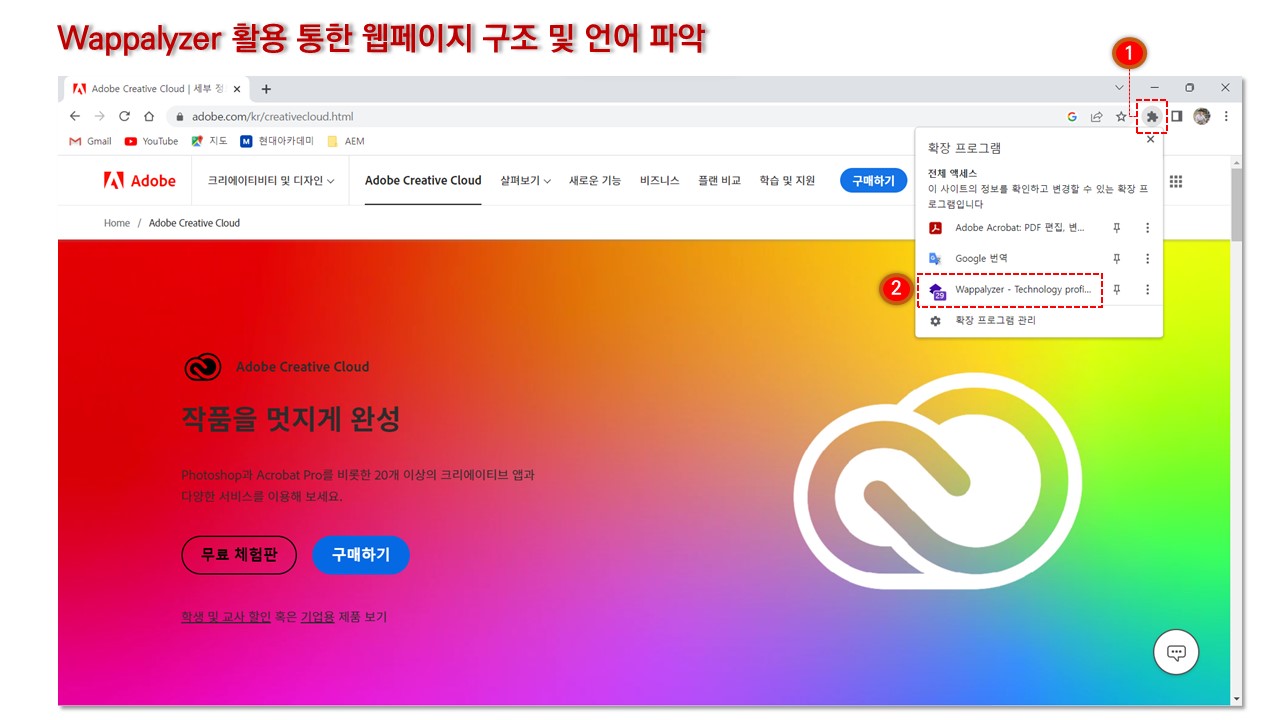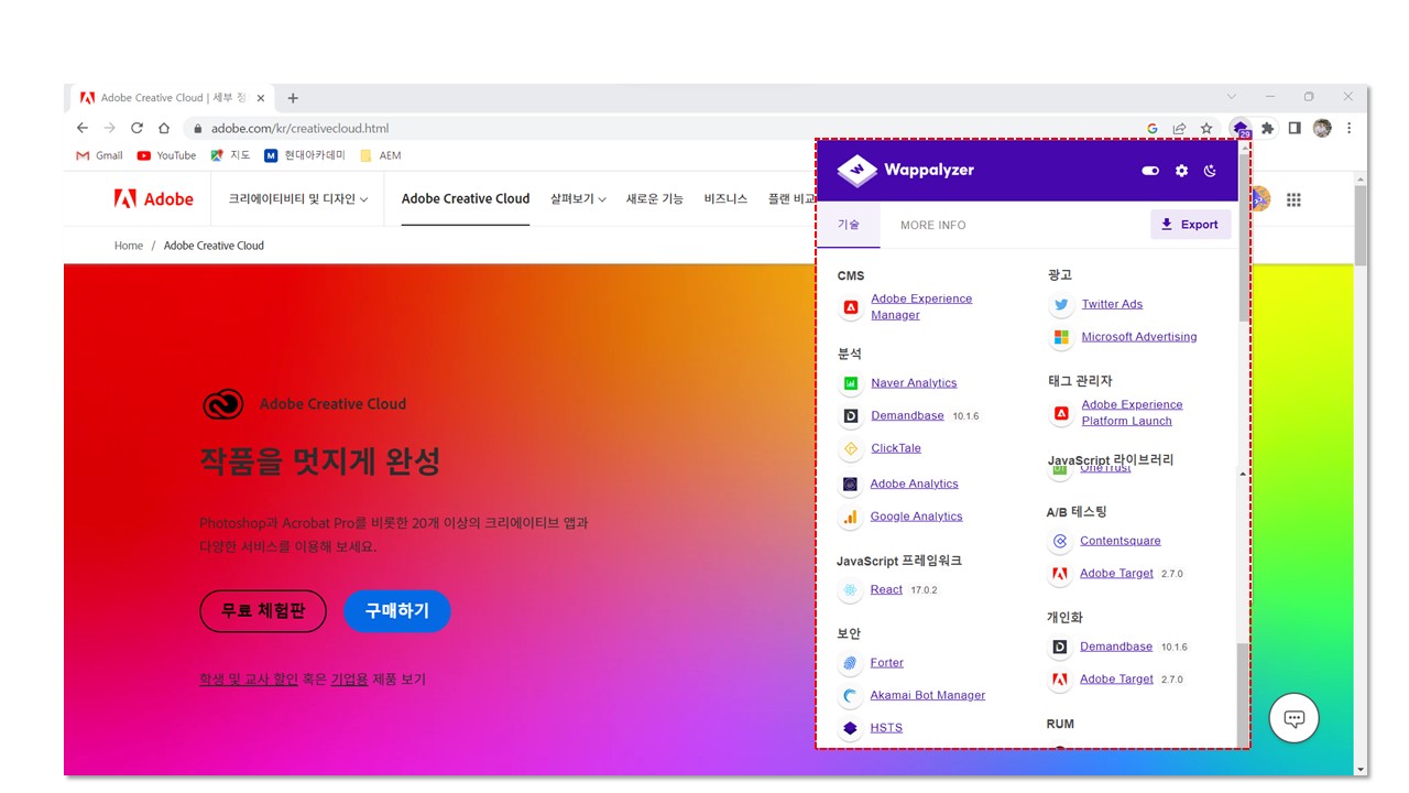 제가 주로 업무를 하고 있는 Adobe 사이트는 어떻게 구성이 되어 있는지 Wappalyzer(와팔라이저)를 통해 살펴봤는데요.