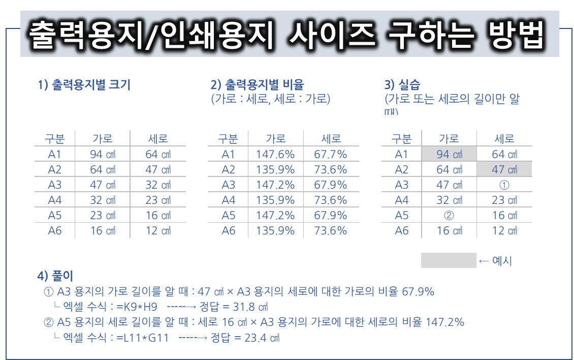 이번 포스팅을 통해 인쇄용지/출력용지 사이즈에 대해 헷갈리는 일을 조금이라도 줄여드렸으면 합니다. 아울러 제공해 드리는 엑셀 파일을 통해, 재미난 공식도 알아볼 수 있습니다. '인쇄용지의 작은 종이의 긴 면은 큰 종이의 짧은 면과 같다'