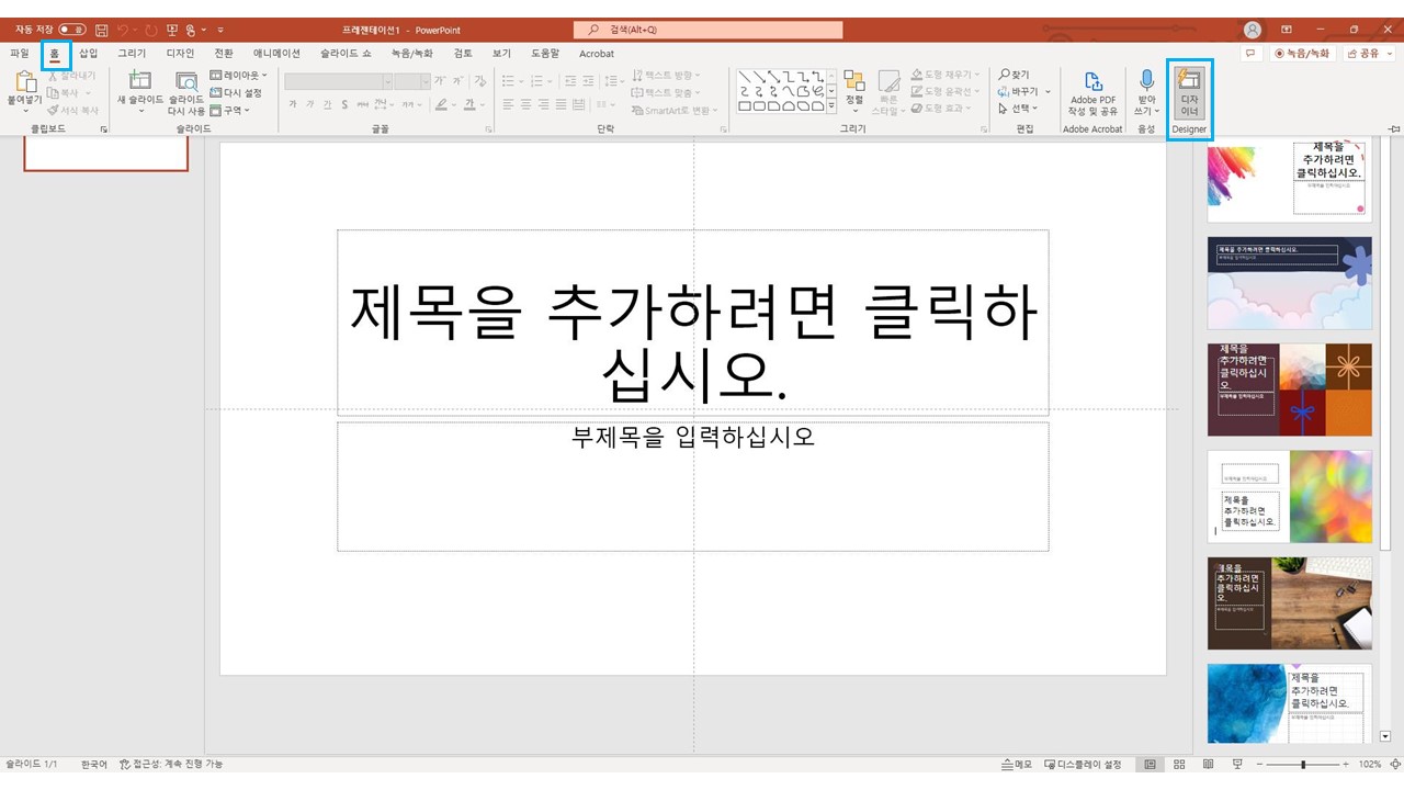 '홈'탭의 우측으로 보시면 '디자이너'라고 있는데, 이걸 클릭하시면 아래와 같습니다.