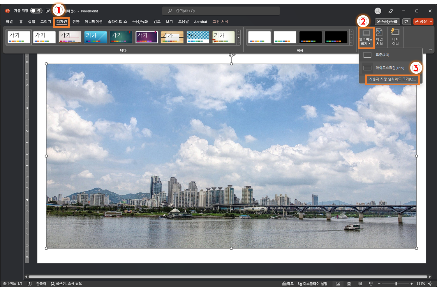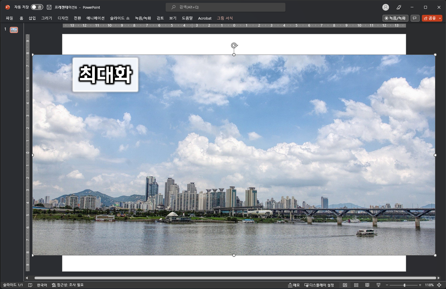 최대화를 한 모습인데, 한강 사진이 슬라이드 배경보다 크게 나타나 있습니다.