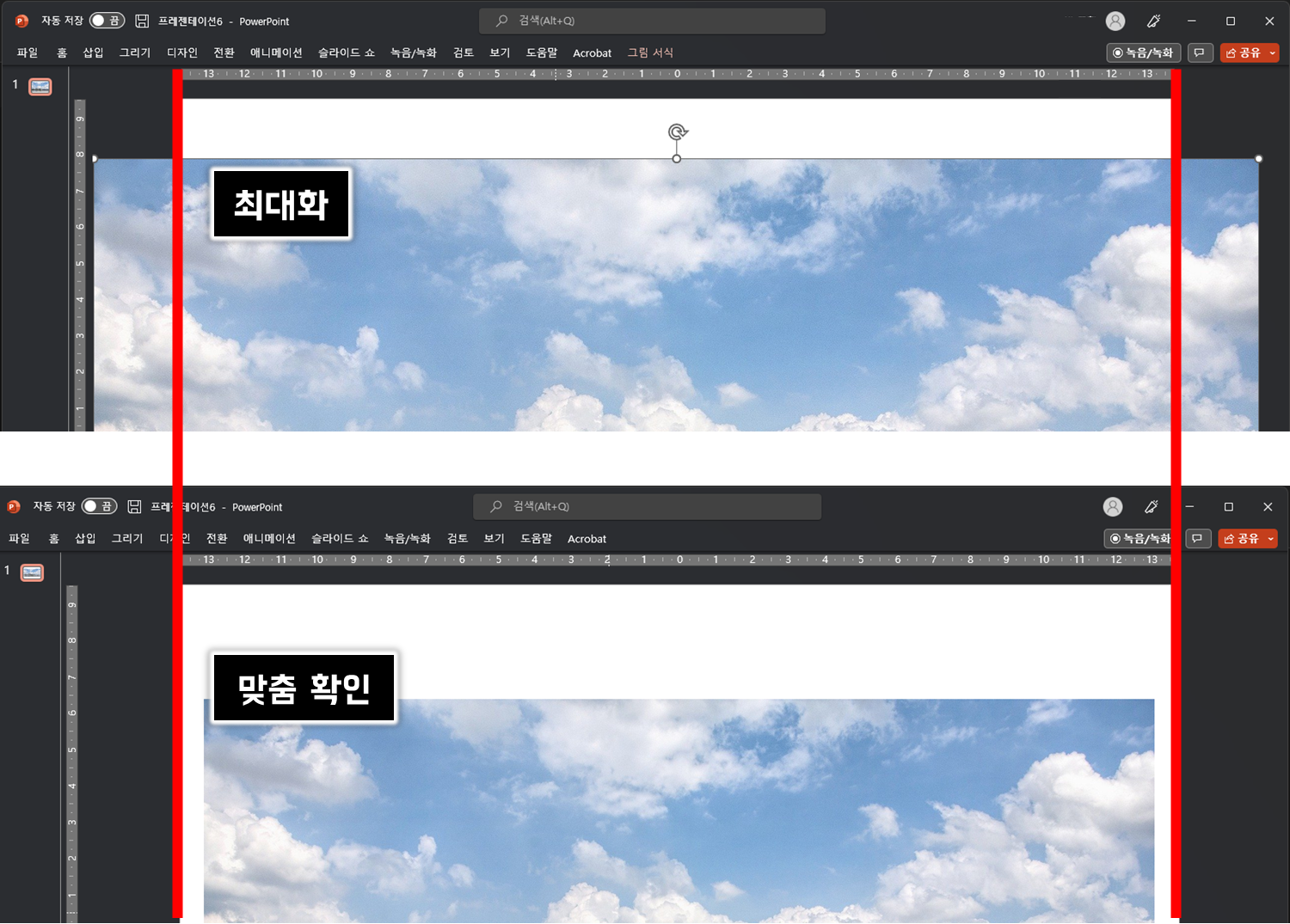 두 가지 옵션을 비교한 이미지인데요. 빨간색 수직선은 두 가지 옵션이 슬라이드 왼쪽과 오른쪽의 길이가 같다는 것을 보여드리기 위해 표시했습니다. 즉, 최대화를 선택하든, 맞춤 확인을 선택하든 슬라이드 용지는 A4 사이즈 그대로입니다. 차이점이 있다면 아래 팝업창에 표시된 대로, (슬라이드는 그대로이고) 새로 조정한 슬라이드의 크기에 맞게 콘텐츠의 크기를 조정하는 것입니다. 아래 이미지를 보시면, 최대화를 할 경우 산의 왼쪽과 오른쪽 이미지가 잘린다는 것이고, 맞춤 확인을 할 경우 이미지가 슬라이드 안으로 쏙 들어오기 때문에 잘리지 않는다는 것을 보여주고 있습니다.