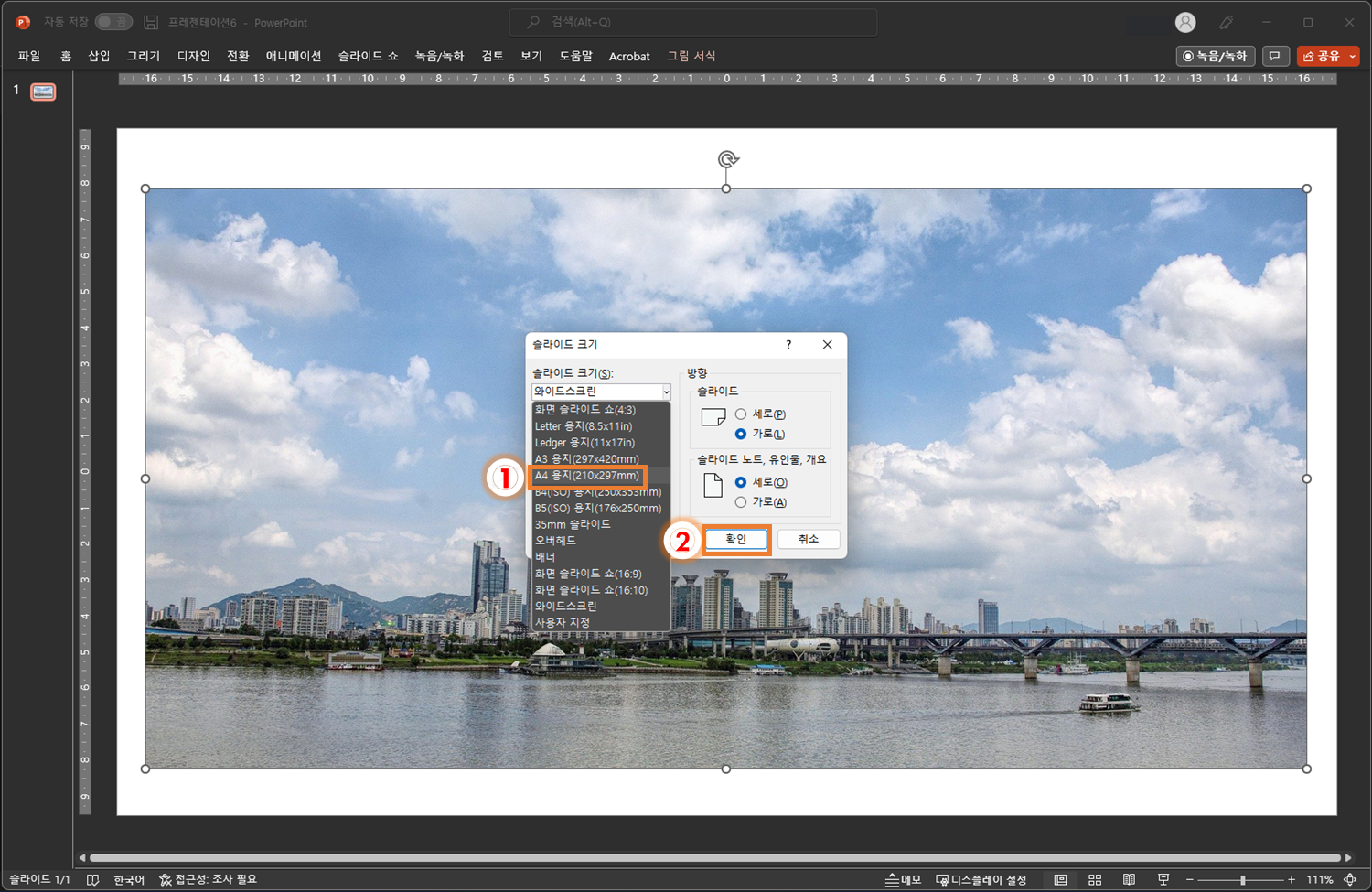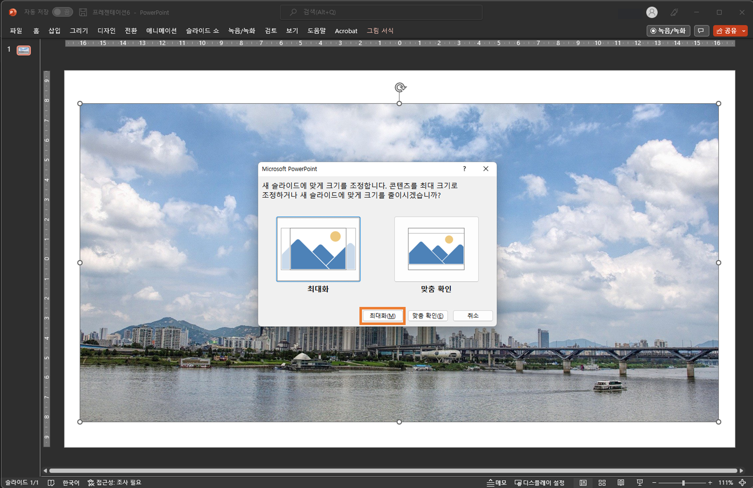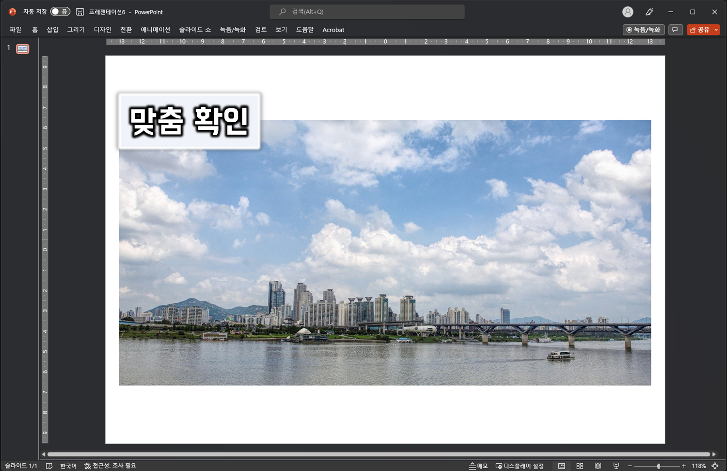 맞춤확인을 한 모습인데, 한강 사진이 슬라이드 배경보다 작게 나타나 있습니다.